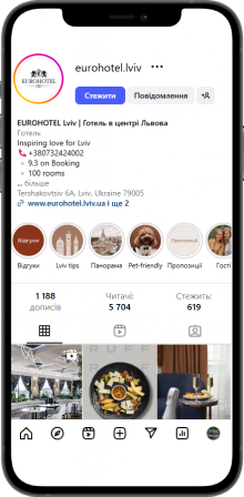Eurohotel — це стильний готель у центрі Львова, який через регулярні зйомки, якісні reels та привабливий контент формує імідж затишного і сучасного місця для туристів і місцевих.